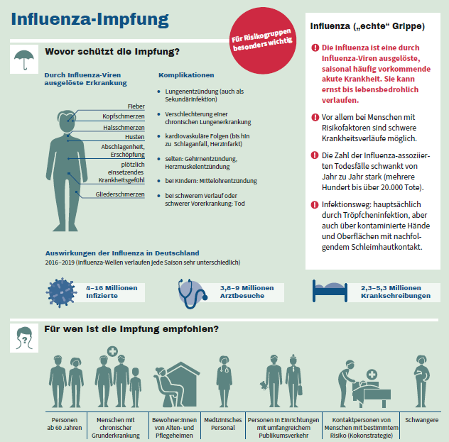 Die echte Grippe (Influenza) ist eine durch Influenza-Viren ausgelöste, saisonal häufig vorkommende akute Krankheit, die ernst bis lebensbedrohlich verlaufen kann. Vor allem bei Menschen mit Risikofaktoren sind schwere Krankheitsverläufe möglich. Insbesondere Patienten mit Herz- und Lungenerkrankungen sind gefährdet. Aber auch für junge Menschen gilt: Influenza - Grippe macht schlapp und kraftlos, und diese Kraftlosigkeit hält dann auch noch länger an. Die Impfung schützt davor !
